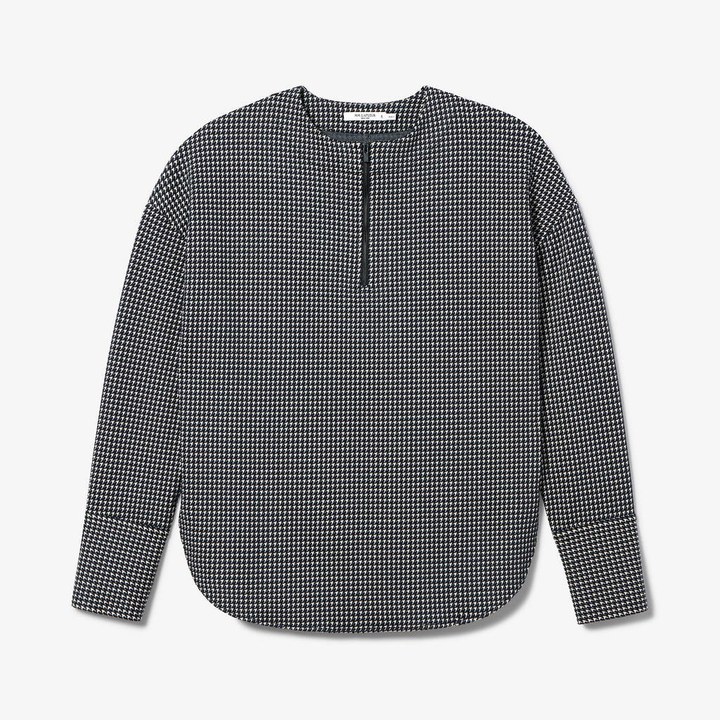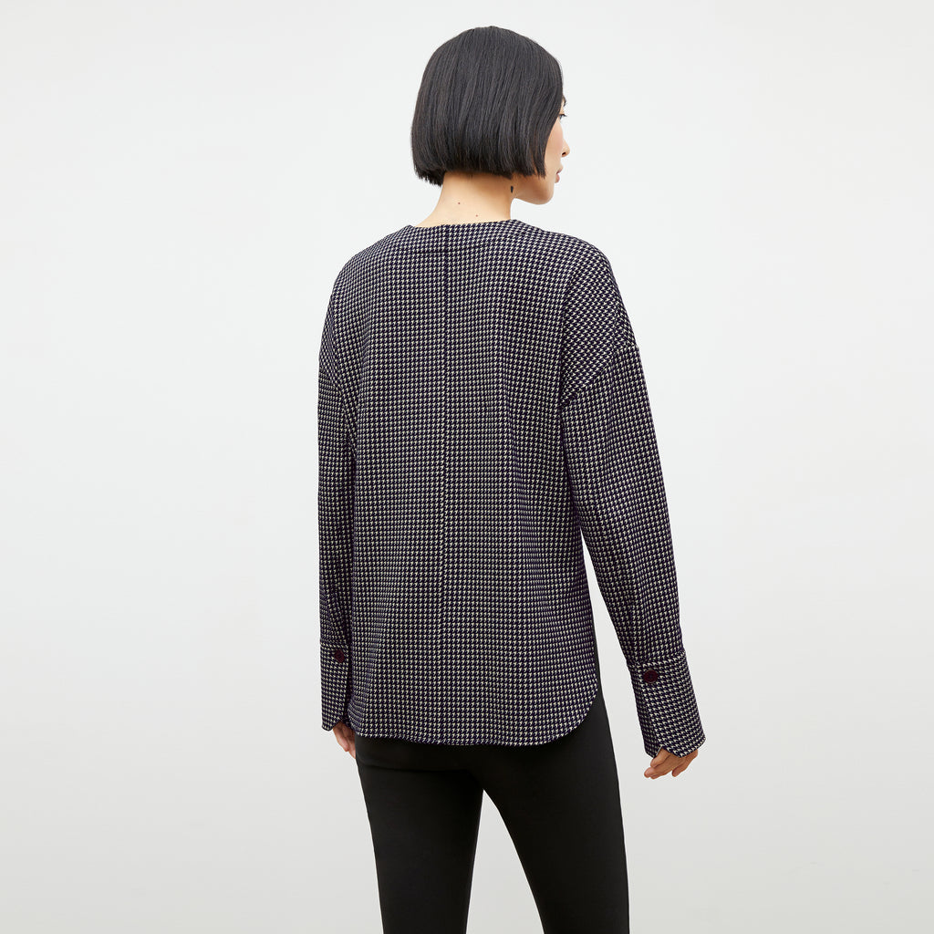The Tully top is crafted from a gorgeous Italian cotton-blend knit that has the look of vintage suiting but the softness and comfort of loungewear. A dropped shoulder creates a relaxed look, while a shirttail hem gives off a polished vibe. If you’re petite, this top will work beautifully as a tunic. PSA: This is a far cry from your grandmother’s houndstooth. Similar to our stretch foulard, this stretch houndstooth is shockingly soft and extremely wrinkle-resistant.