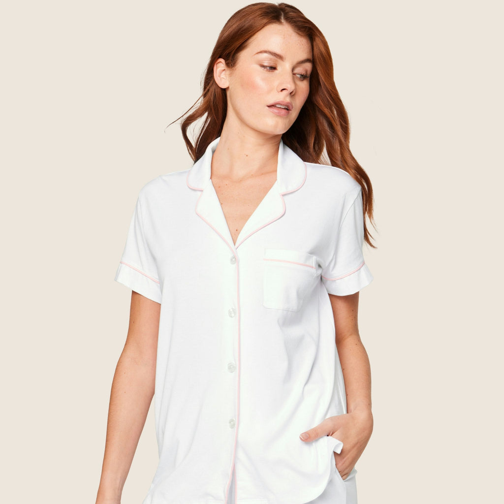 For the warmer months, an abbreviated version of our Classic PJs with all the same refinement (lovely tailored piping details, deep pockets) but in a flirty, comfortable mid-thigh length short.
